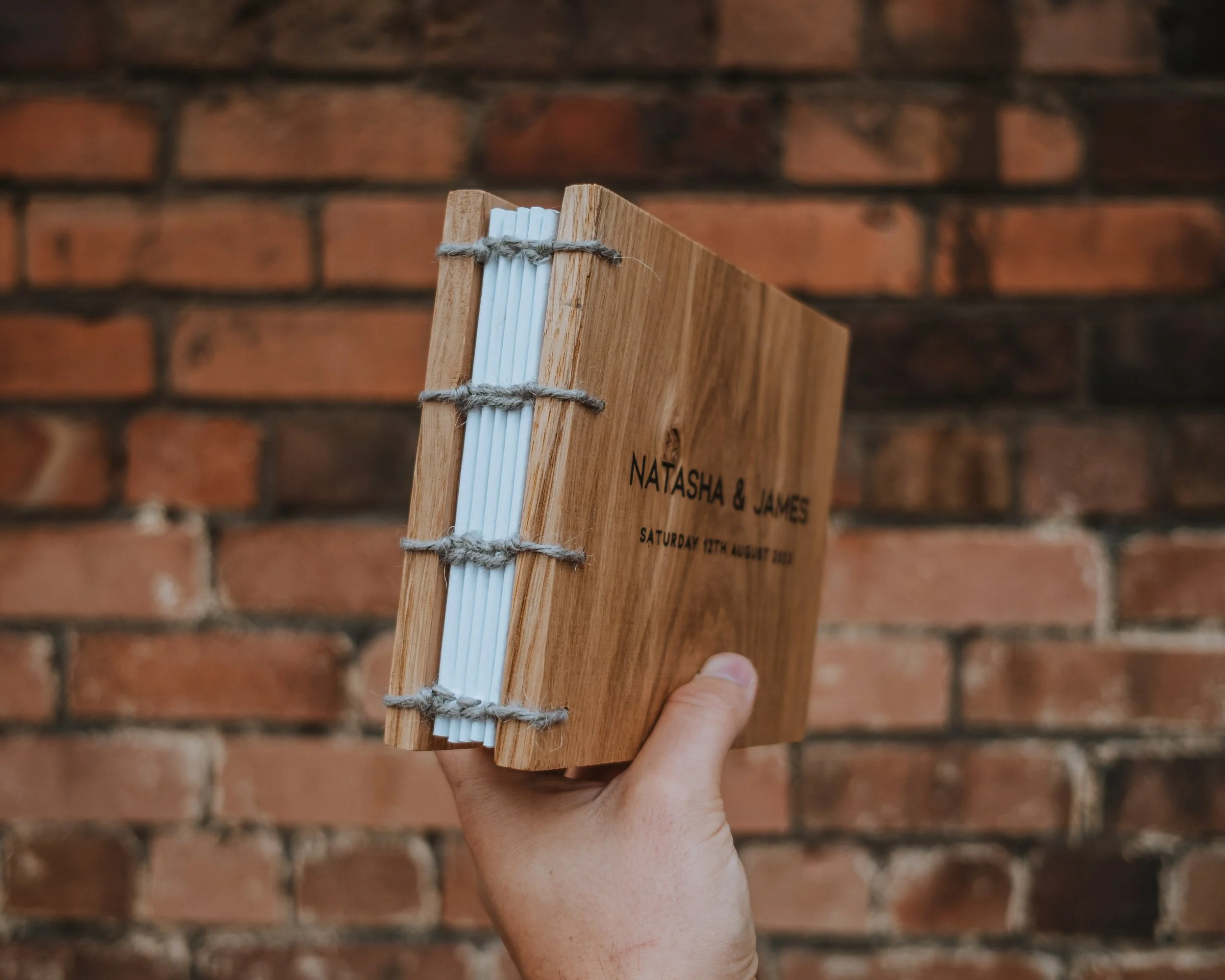 All of our wedding packages include one of our beautiful photo albums. They are the perfect way to keep all your photos and messages safe from your photo booth experience for years to come. Our unique albums are hand made using solid oak, high quality recycled papers and natural twine. As standard the front cover features our logo with the option to upgrade to a personalised cover for £35.